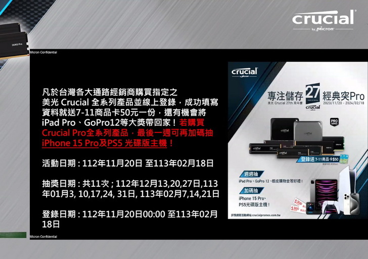 全台灣各大通路經銷商購買指定 美光 Crucial 全系列產品並線上登錄,填寫資料就送7-11商品卡50元,可以抽iPad Pro、GoPro12;購買 美光 Crucial Pro 全系列產品,最後一週可再加碼抽 iPhone 15 Pro及PS5 光碟版主機。