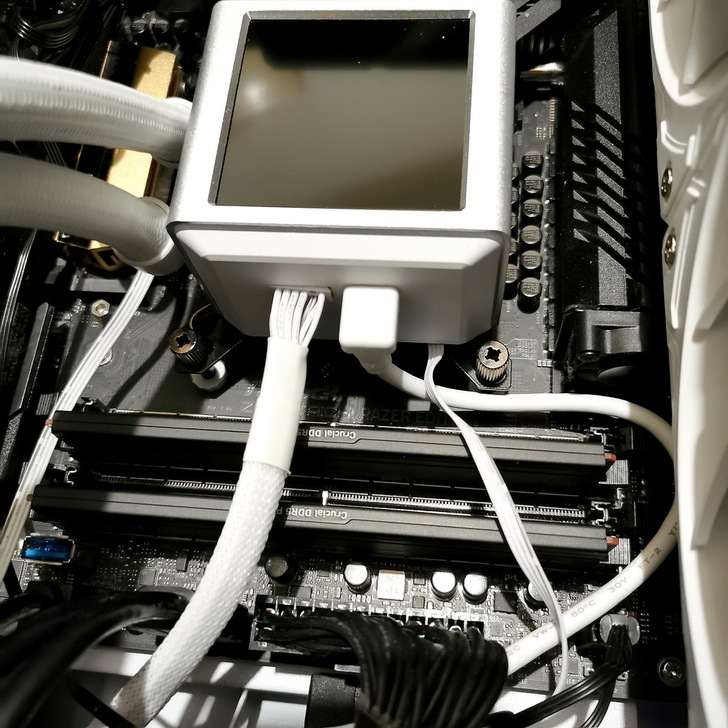 ▼ 美光 Crucial Pro DDR5-6000 因為使用鋁製矮版散熱器,完全不會影響一體式水冷的水冷頭安裝,線材不需要彎彎折折。