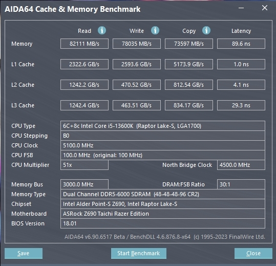 ▼ AIDA64記憶體測試中 讀取為82111MB/s,寫入為78035MB/s,複製為73597MB/s,延遲為89.6ns。