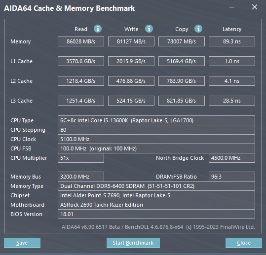 ▼ 在BIOS中不加壓直接把 Crucial Pro DDR5-6000 超頻至 DDR5-6400,使用 AIDA64 記憶體測試 測得 讀取為86028MB/s,寫入為81127MB/s,複製為78007MB/s,延遲為89.3ns。