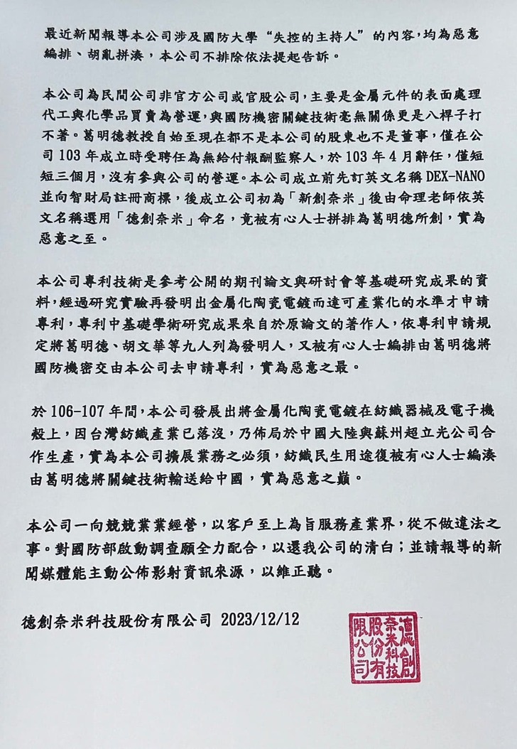 遭控為葛明德人頭公司,「德創奈米」公開發布聲明。德創奈米科技股份有限公司近日被媒體調查報導指稱,其為國防大學教授葛明德於民間成立的人頭公司,德創奈米科技股份有限公司對外公開發布聲明,聲明書全文如下:
