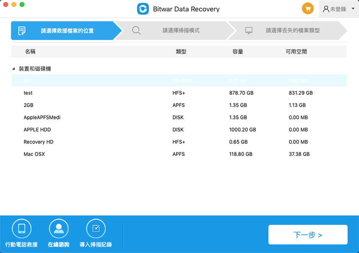 步驟1:啟動安裝後的Mac版Bitwar檔案救援軟體,選擇要救援檔案的分區或存儲裝置。