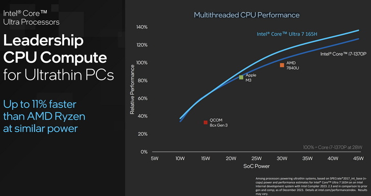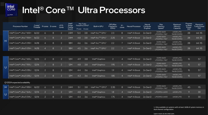 Intel Core Ultra支援筆電H與U系列型號,最高階Core Ultra 9 185H要等到2024 Q1才會推出。
