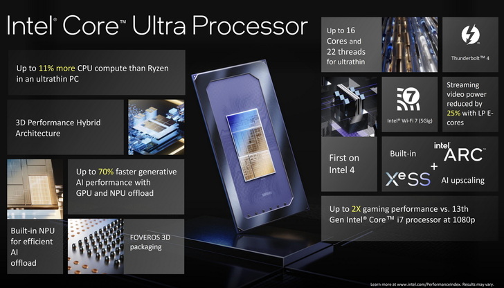 Turbo頻率高達 5.1 GHz、記憶體容量高達64 GB LP5/x和96 GB DDR5、無線功能整合Intel Wi-Fi 6E與獨立的Intel Wi-Fi 7(5 Gig)、Intel Killer軟體、Intel Bluetooth LE音訊、Thunderbolt 4、OpenVINO工具套件增強AI運算性能。