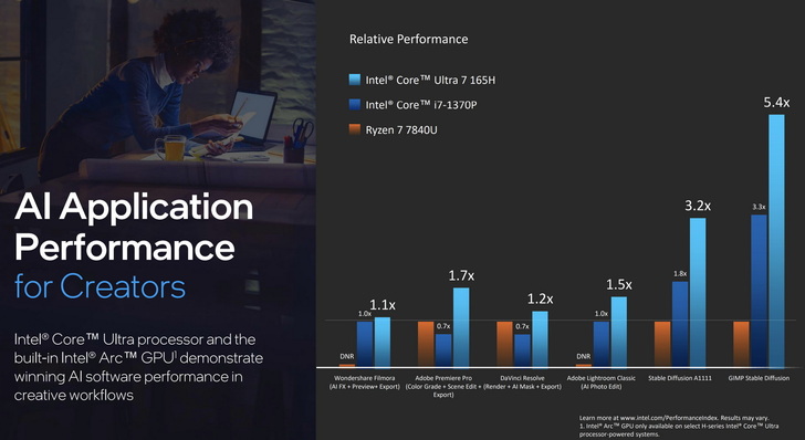 3款不同CPU在AI軟體應用的表現,Intel Core Ultra 7 165H對比Ryzen 7 7840U最高可達5.4倍。