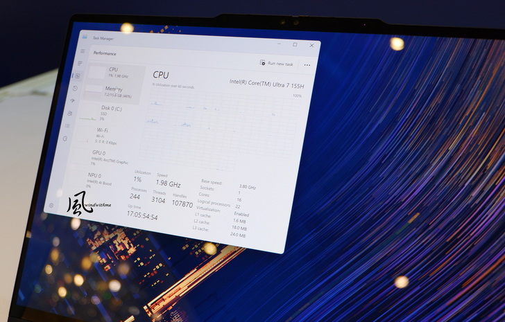 現場也有展示AI辨識軟體透過Core Ultra系列處理器搭載AI加速器NPU神經處理單元能有效降低CPU負載率。