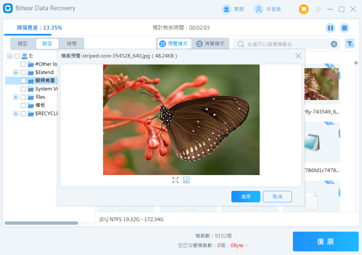 按照上述步驟操作,丟失的檔案將立即快速地被復原。Bitwar檔案救援軟體在電腦上執行,可以掃描硬碟以及連接到電腦的所有存儲裝置如移動硬碟、記憶卡、隨身碟、數碼相機…。在掃描過程中,如果發現了要救援的檔案,您無需等待它完成掃描即可點擊停止或暫停按鈕然後預覽及救援的檔案。您也可將掃描結果以BW格式保存,下次導入即可在本次掃描的基礎上查看和救援。