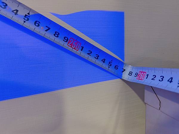 我們的白牆範圍可投放100吋,本機放在31cm高的茶几,投放高度正好(原本65cm稍嫌過高)