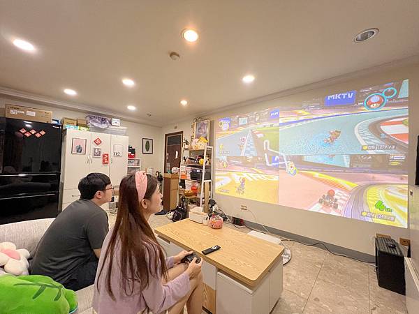 玩瑪利歐賽車的時候,多人畫面分割也不會覺得擁擠~*IPhone 13 pro拍攝,晚上室內燈全亮