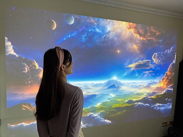 我們把本機放在地板投放,距牆面73cm,投放高度正好平視,投放的畫面真的好高大啊😆(本人身高160cm充當比例尺)以上測試數據提供大家參考,都可以參考依照自己的喜好調整哦!*IPhone 13 pro拍攝,白天室內燈全暗