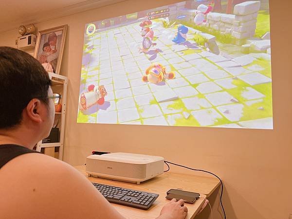 EH-LS650有兩個HDMI,可連接電腦、Switch、PS5等遊戲機,實測電腦Steam玩派對動物,低延遲操作的回饋感依然很棒!(總是躺地板的回饋感另計)*IPhone 13 pro拍攝,晚上室內燈全亮
