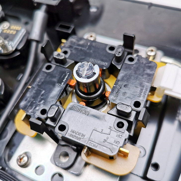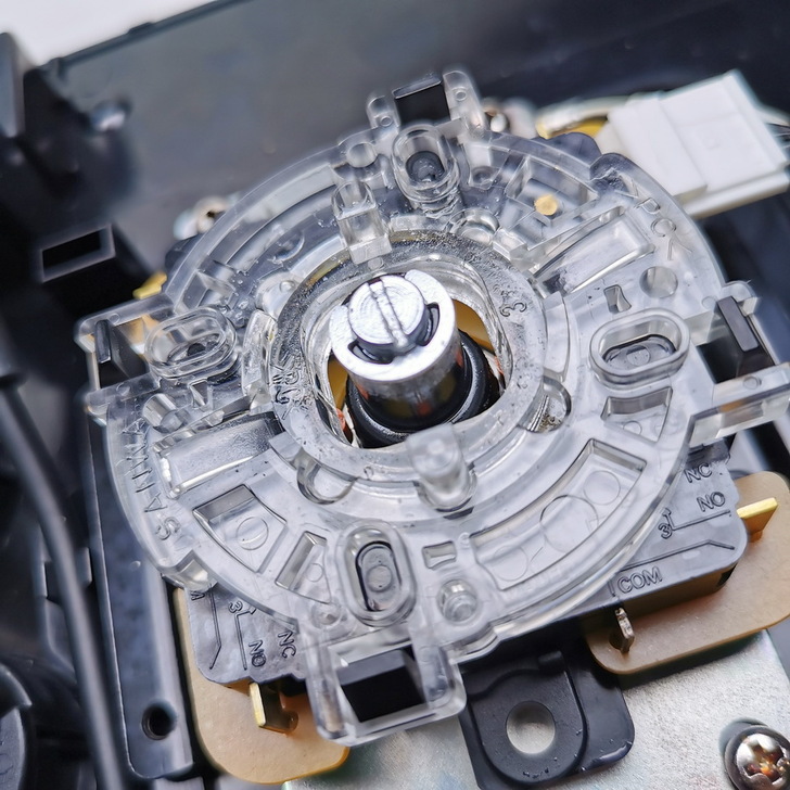 ▼ 檔板上面的四個塑膠掛勾向內推,很簡單就可以移除檔板,可以看到下面的微動開關。