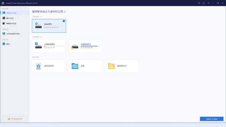 在 Windows 11 中下載 EaseUS Data Recovery Wizard,輸入序號就可以啟用專業版。首先將 18 個測試檔案放入隨身碟中,將檔案刪除,再進行一次初階格式化。將隨身碟安裝到 Windows 上,以 Data Recovery Wizard 選擇 Lexar 磁碟,再點選右下角「查詢丟失資料」。