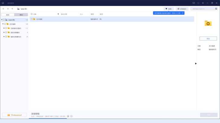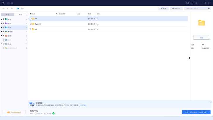 等待下方進度條跑完,會顯示具體的檔案數量和容量。可以全選或是選擇自己需要救援的標的檔案,我選擇全選,之後再來一個一個過濾。