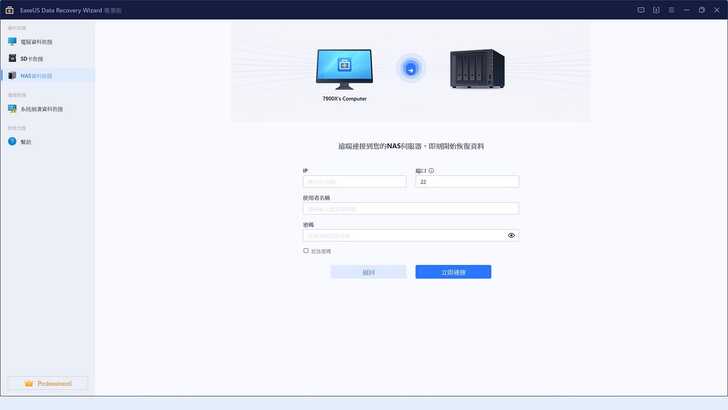 因為平常不管是個人還是公司,都有使用多台 NAS 的經驗和習慣。所以當看到功能列表有 NAS 資料救援時,我是挺好奇的。當然受限 NAS 平常都是在線運作,所以沒有拿來實驗看看效果,但還是給大家看看他的介面。首先他會在區域網路內搜尋 NAS,不過看來我的 NAS 沒有被它識別到,可以選擇「手動連線」。