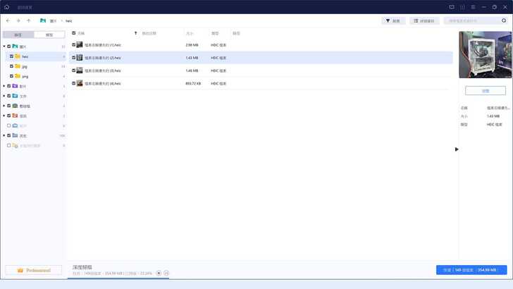 除了以「路徑」的方式來瀏覽,在功能列上方,還可以切換到以「類型」檢視。例如根據檔案屬性可以看到「圖片」,在圖片底下又可以看到不同副檔名的歸類。瀏覽檔案的同時,也可以看到各個檔案的大小。如果你只是特定一個或少數資料要救援,也可以從右上角的搜尋功能和篩選功能,一邊看看有沒有撈到,可以大幅減輕心理負擔。