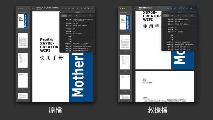 我準備了兩份 PDF,一份是韓國之前發表的 LK-99 超導體論文。另一分是我目前在使用這台 AMD Ryzen 7900X 桌機使用的主機板,ProArt X670E Ceartor 的 User Manual。兩份 PDF 都有順利救回來,檔案大小也完全相同,只有檔名佚失。