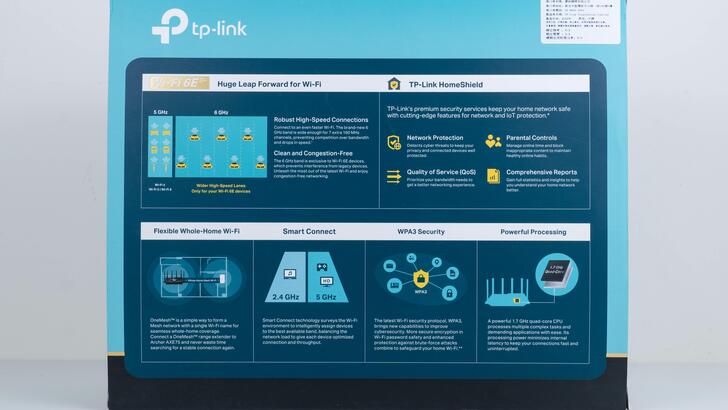 整體設計稜角分明,沒有任何的圓弧,我覺得挺好看。規格上,Archer AXE75 支援 AXE5400,分別是 5GHz、6GHz 各 2402Mbps,2.4GHz 574Mbps。搭載的處理器是博通的 BCM6756 四核心 ARM-A7 1.7GHz。
