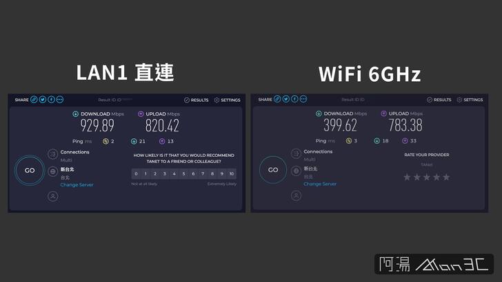 透過公司的外網測一下 WAN 的速度,電腦透過路由器 LAN1 測 speedtest,速度可達下載 929.89Mbps,上傳 820.42Mbps。然而透過 WiFi 6E 6GHz 測速,下載卻只剩 399.62Mbps,上傳維持 783.38Mbps,只有下載速度明顯降低,ATon 認為應該是前面的網管或是切換器的 QoS 等東西在作怪,畢竟這個速度還是比我們公司其他牌的 WiFi 6 路由器還要快。