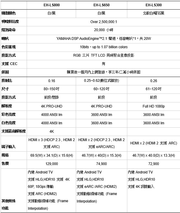 我整理了EH-LS800、EH-LS650、EH-LS300三款的規格如下表: