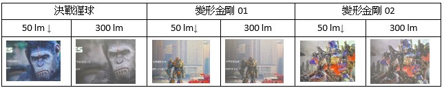 開燈狀態下四點區域平均約為300lm、關燈狀態下四點區域平均約為50lm。所以我拍攝了三支電影的比較畫面給大家參考(模式設定)。如同先前提到,當平均照度達300 lm時畫面明暗度差異其實還是有的,但畫面明暗細節仍能呈現,整體來說我覺得還不錯!