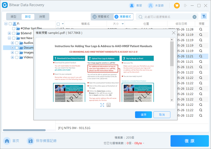 -Bitwar檔案救援軟體將快速得掃描您丟失的檔案。所有被掃描到的檔案都將被一一列出。您可以根據檔案名、類型、路徑等找到檔案並預覽它。然後選擇要救援的檔案,點擊“復原”按鈕將其保存到安全的分區或存儲裝置。
