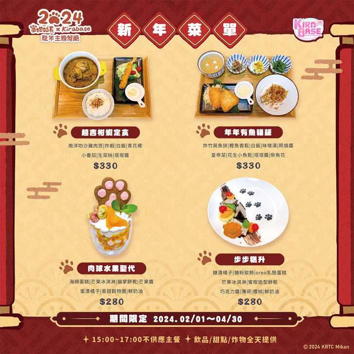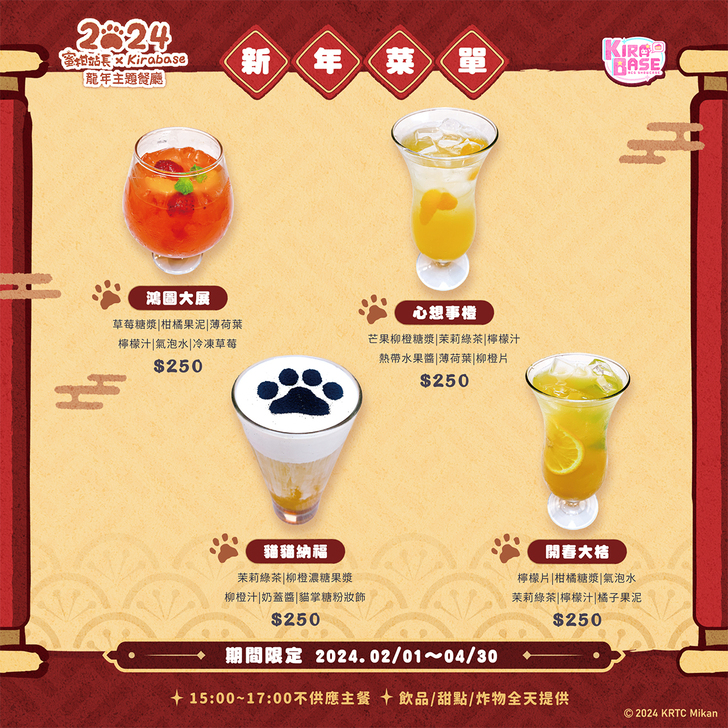 高雄捷運人氣超高的貓站長蜜柑任職已超過3年,值勤日總是有超多粉絲前來探班,蜜柑站長此次派出牠的Q版分身到KIRABASE出勤。適逢龍年過年,本次合作以龍年春節為主題,主視覺除了有濃厚春節氣氛外,還有龍年造型的蜜柑站長,現場也佈置了萌到不行的蜜柑立牌提供給粉絲合照。餐點部分推出以蜜柑站長的代表色橘色以及水果蜜柑發想的8款特色餐飲,為此次合作注入了專屬的樣貌與靈魂。蜜柑站長到,幸福身邊繞,希望能與柑仔蜜們一起過個貓肥家潤的好年!