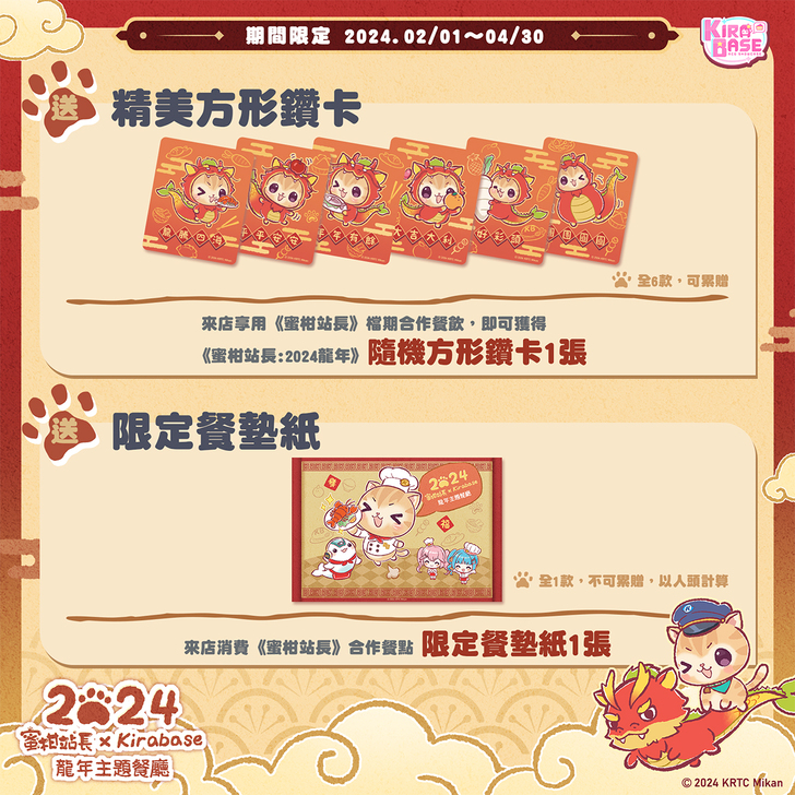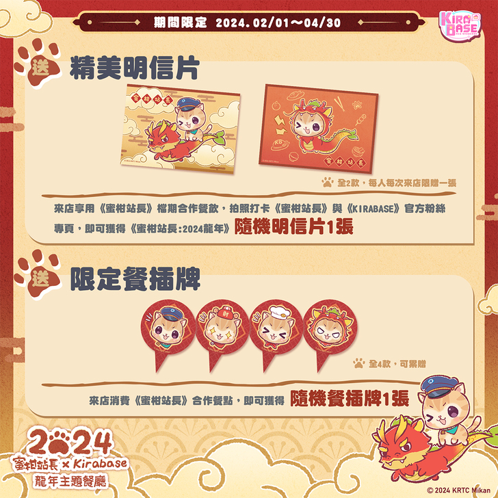 ◈凡來店享用《蜜柑站長》合作餐飲,拍照打卡tag《蜜柑站長》與《KIRABASE》官方粉絲專頁,即可隨機獲得《蜜柑站長:2024龍年》明信片1張(全2款)。