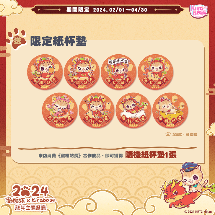 活動期間內,凡於店內消費特製合作餐點滿額即可獲得《蜜柑站長:2024龍年》隨機錢幣鑽卡1張。(圖/KIRABASE提供)