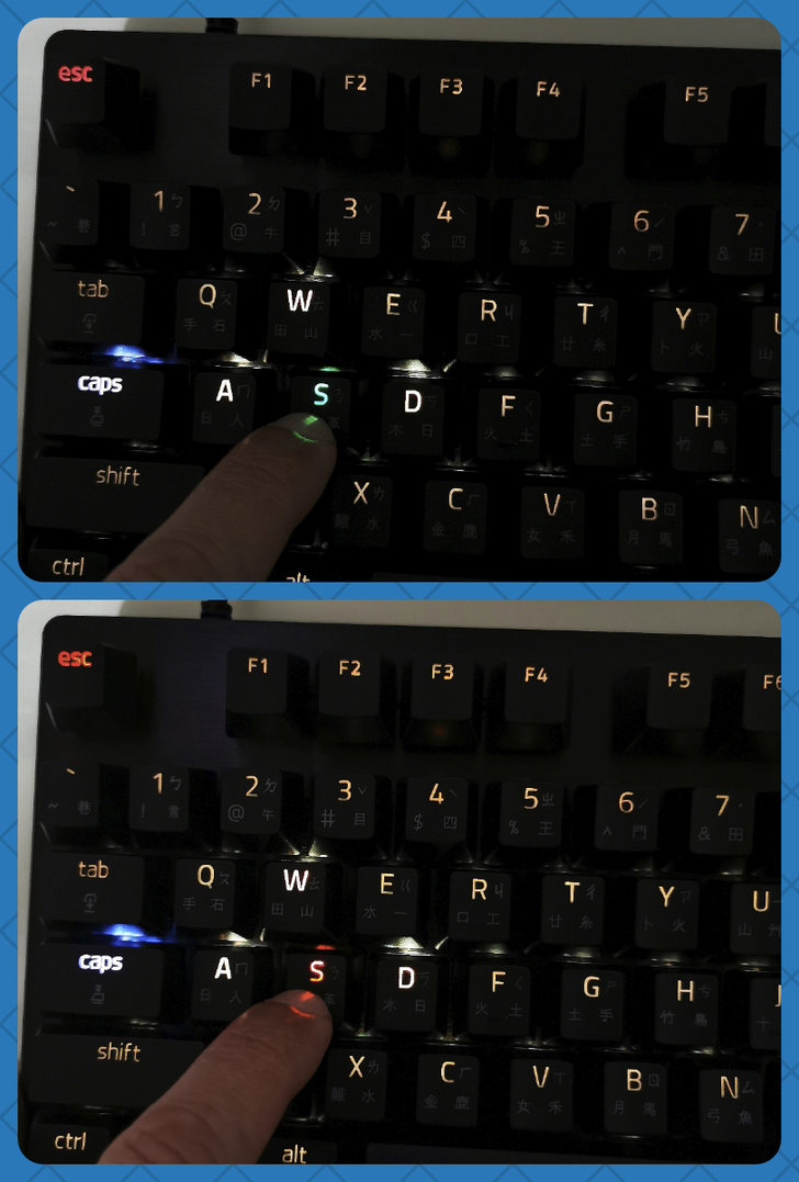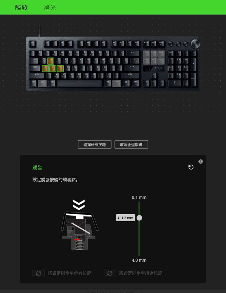 ▼ 此時透過按壓按鍵的力道,就可以看到 鍵帽 會顯示 綠燈(觸發點)跟紅燈(重設點),調整至自己想要的鍵程後,同樣按 ESC 就可以儲存好設定。