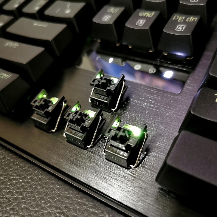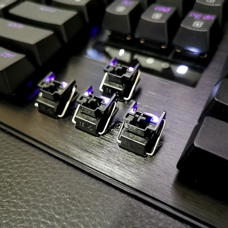 ▼ Razer Huntsman V3 Pro 上蓋材質為 5052航空級髮絲紋鋁合金;拿掉鍵帽可以看到 第2代 Razer 類比式光軸,軸體上有 RAZER及GEN-2 字樣。