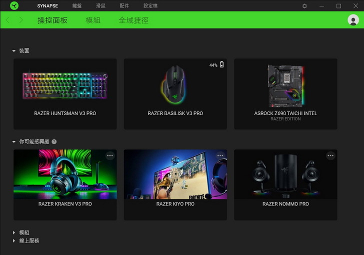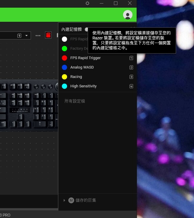 ▼ Razer Synapse 軟體介面中,每個設定檔都會呈現不同的顏色。