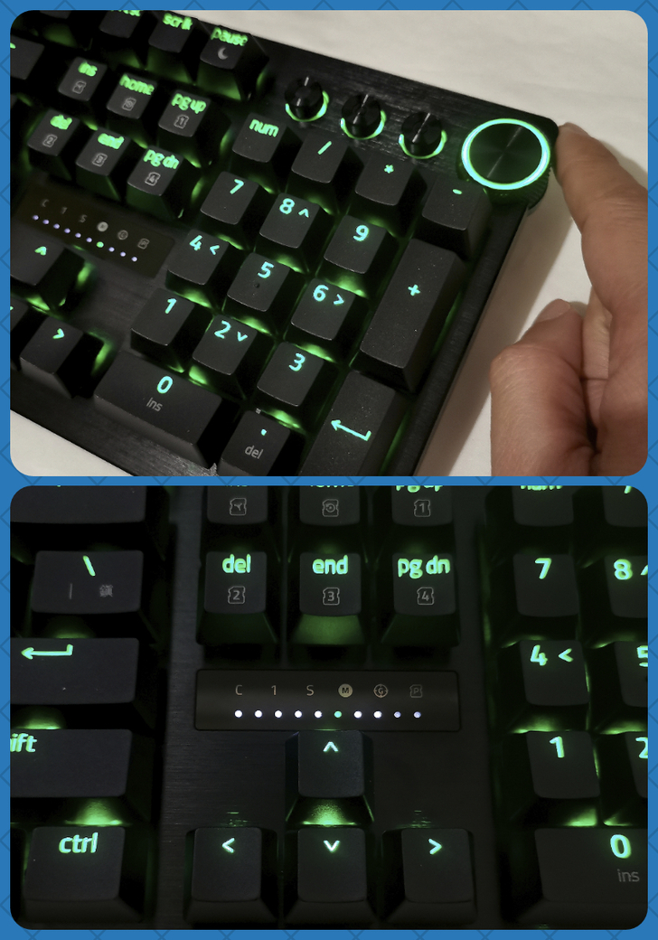 Razer Huntsman V3 Pro 可以不需要透過軟體,直接在鍵盤上利用組合鍵就可以 切換鍵盤模式、調整觸發點、快速觸發靈敏度;使用者帶著一把鍵盤就可以符合任何狀況,需要更改設定時,直接在鍵盤上操作就可完成。