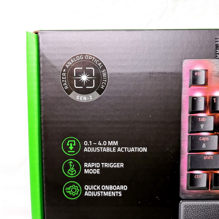 ▼ 外盒正面左側 標示出使用 第2代 RAZER 類比式光軸、0.1至4.0mm 調整觸發距離、快速觸發模式、鍵盤內建調整模式。