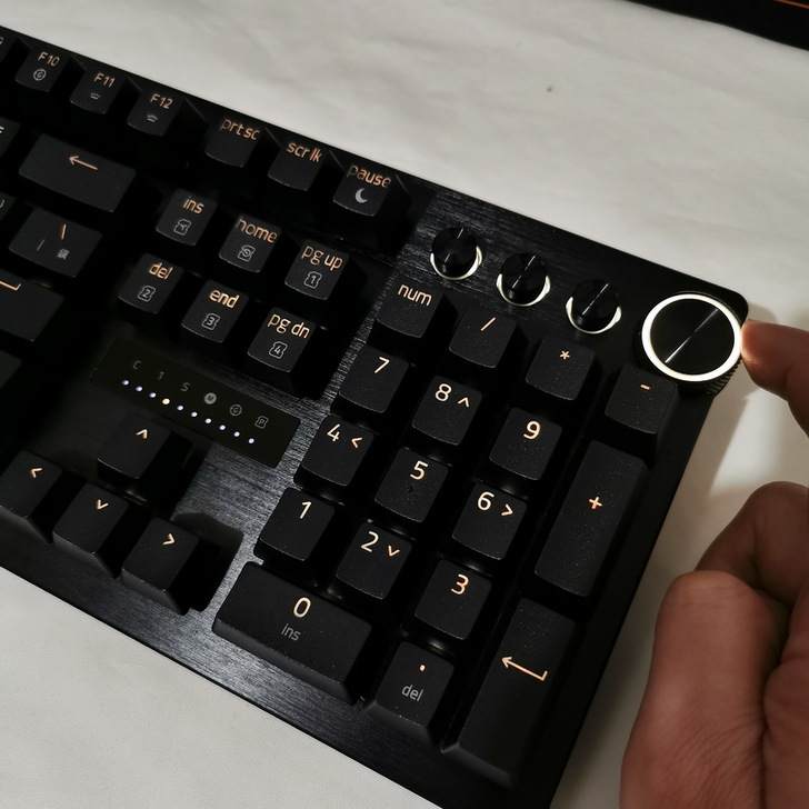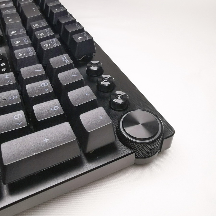 ▼ 右上角有 巨集鍵、多功能媒體鍵、多功能數位旋鈕 - 多功能數位旋鈕有稍稍外露設計(側滾控制),滾動的話會隨著音量大小聲改變燈光明亮度,一鍵靜音就變紅色。