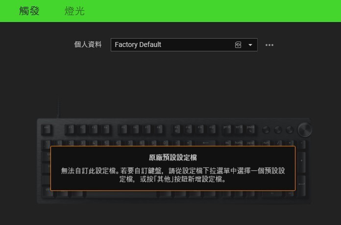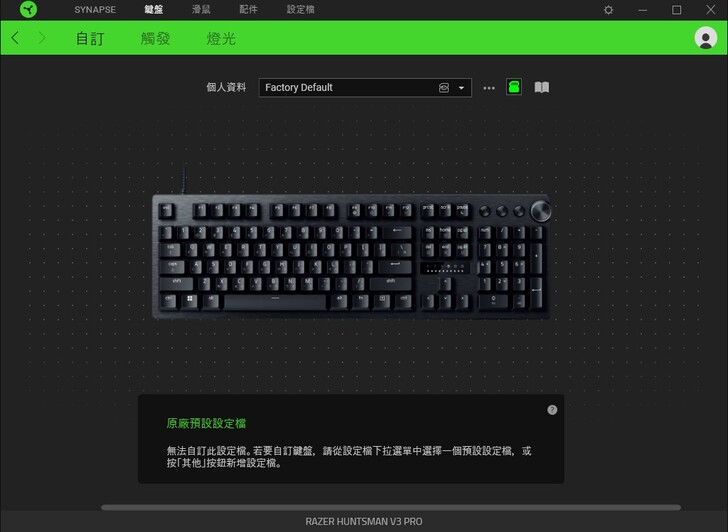 ▼ Razer Synapse 軟體介面中選擇 Razer Huntsman V3 Pro,可以看到提示在 原廠預設設定檔 的話,無法自訂鍵盤的所有按鍵。