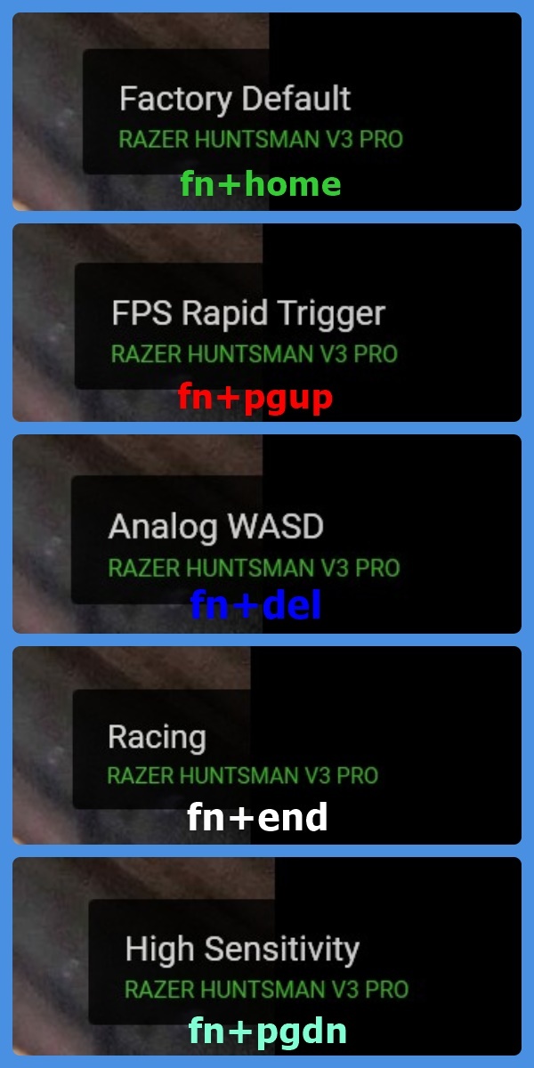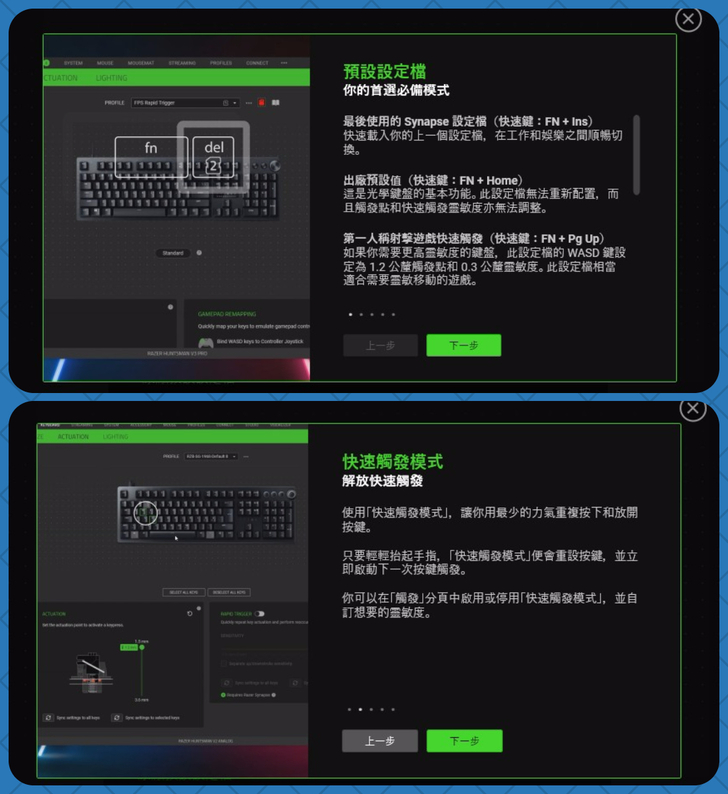 這段時間使用 Razer Huntsman V3 Pro 之後,已經漸漸上手其觸發設定,針對幾款不同遊戲都各自設定了設定值,在不用開啟軟體的狀況下,使用組合鍵就可直接切換實在是非常方便。