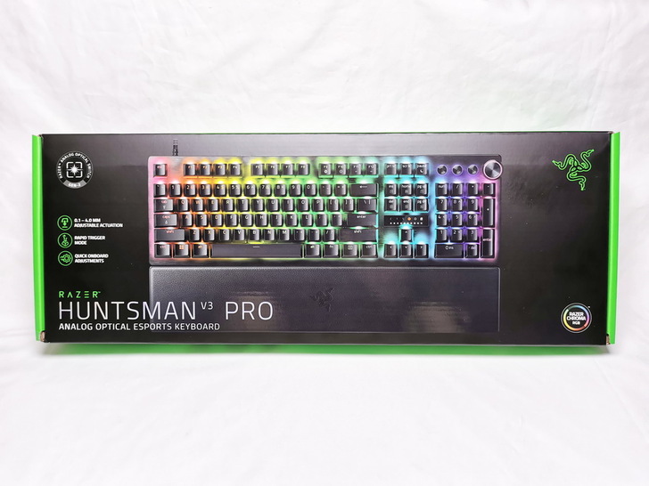 ▼ 本篇主要以 Razer Huntsman V3 Pro 為主,可以看到外盒是傳統的雷蛇配色,本體照呈現炫麗的燈效。