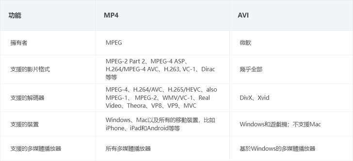 AVI(Audio Video Interleave)和MP4(MPEG-4 Part 14)都是多媒體封裝格式,是將聲音與影像同步組合在一起檔案格式。您可以通過下面的表格了解AVI和MP4之間的更多差異: