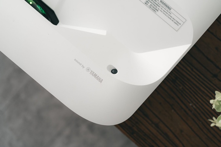 EH-LS650正面印有Epson LOGO字樣,左上角有著投影機狀態指示燈,並且在金屬網孔下內藏一組Yamaha 2.1聲道的藍牙喇叭,測試從0到開好機,大概只需要5秒的時間