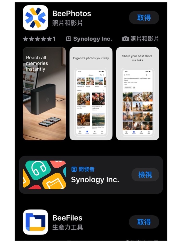 ▼ 直接開門見山,用行動裝置您需要下載下面兩個APP,BeePhotos就是管理照片和影片的,先說很好用,喜歡拍照錄影的真的不要錯過,BeeFiles則是管理你在BeeStation當中一切儲存的資料,就把它想像成一個行動硬碟來看就好了。