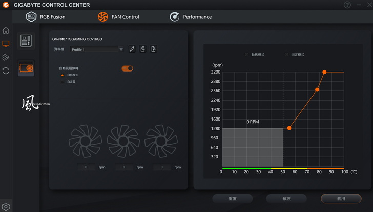 風扇內建相當具有辨識度的三環燈發光,支援RGB FUSION技術可透過技嘉控制中心調整燈號或與其他配備同步燈號。