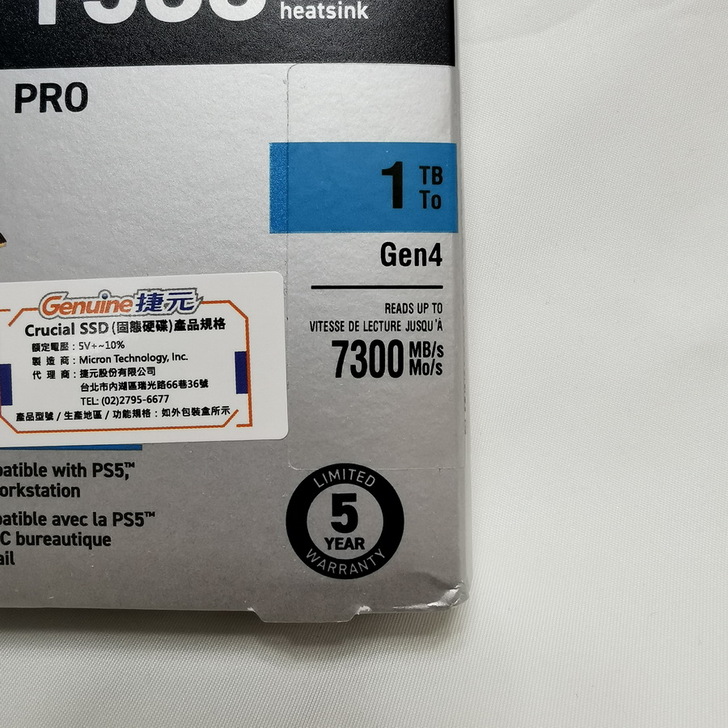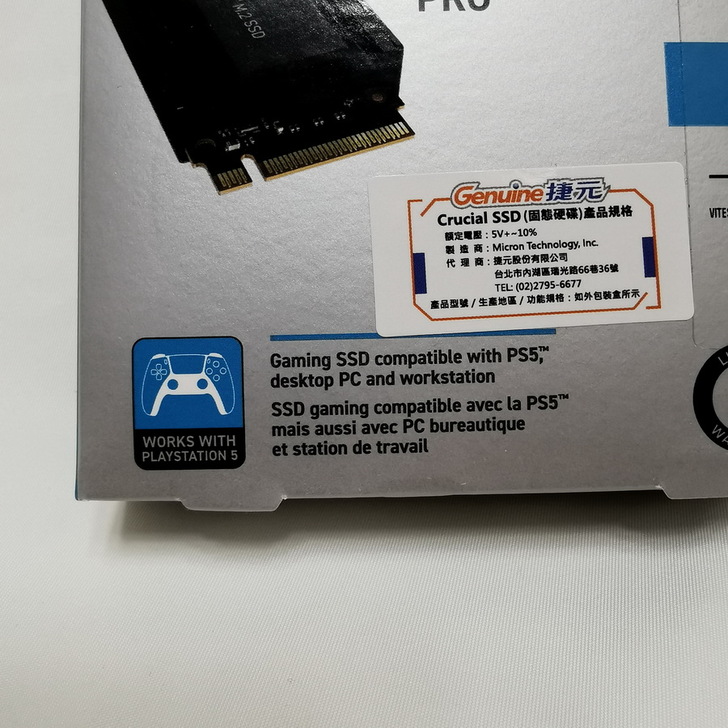 ▼ 美光盒裝上面都有 捷元代理貼紙,有 SONY PS5 圖示,代表完整相容 SONY PS5 的擴充。
