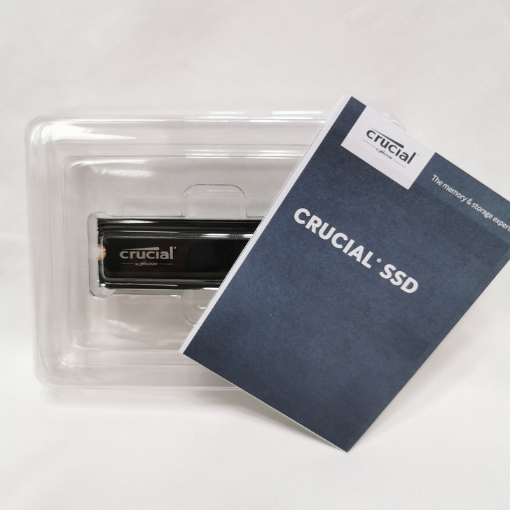 ▼ 內容物 - 說明書、固定在塑膠盒中的 美光 Crucial T500 1TB Gen4 NVMe SSD。