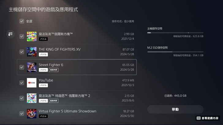 ▼ 選取主機內的全部遊戲及應用程式,可以看到要移動的總容量為 445GB。