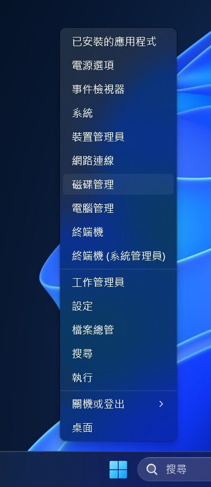▲Windows視窗處,點右鍵就會跳出這列表單,選「磁碟管理」