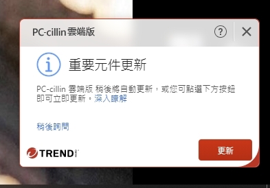 ▼ PC-cillin 雲端版 如果有重要元件更新,會彈出小視窗通知更新,避免使用者錯過重要元件更新,讓病毒跟駭客有機可趁。