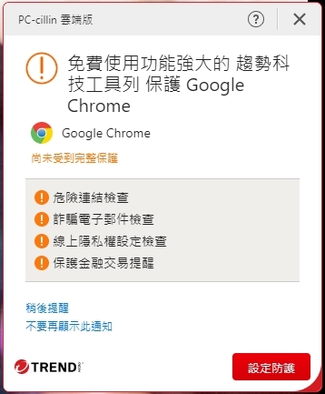 ▼ PC-cillin 2024 雲端版 如果偵測到瀏覽器沒有 開啟防護,會很貼心的 彈出視窗 通知設定防護。
