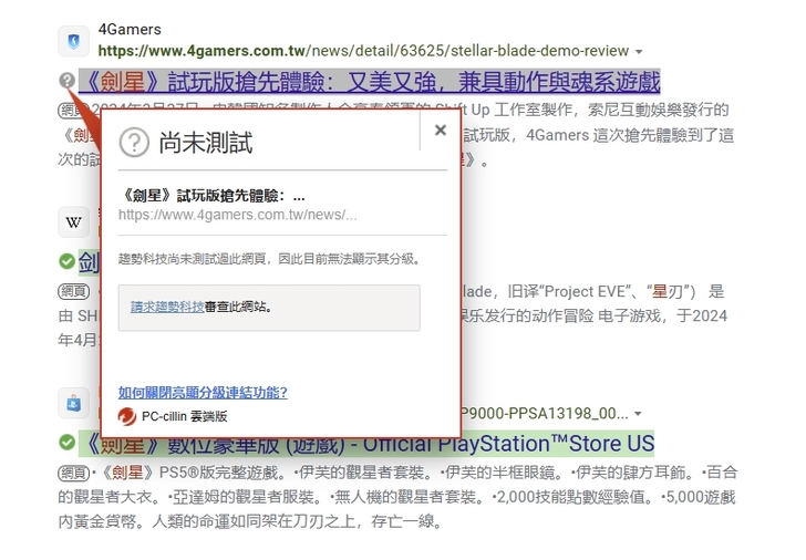▼ 令人滿意的同樣是 亮顯連結,尤其是看到 灰底 尚未測試 連結,總是會很自然的點擊 請求趨勢科技審查此網站。