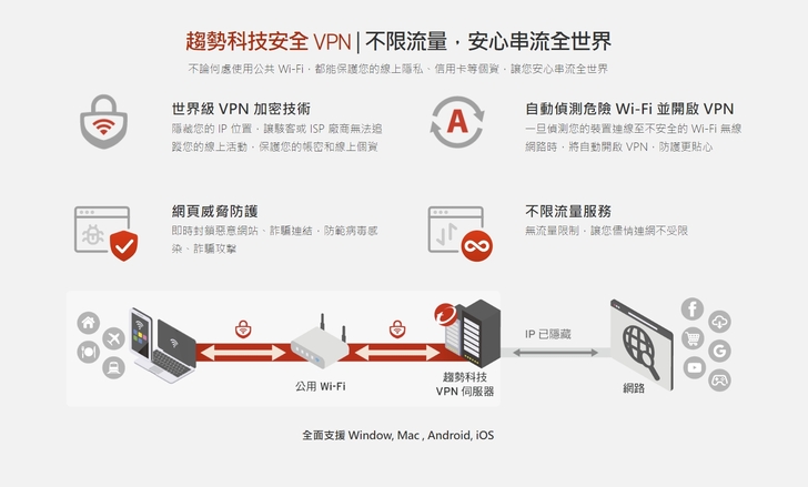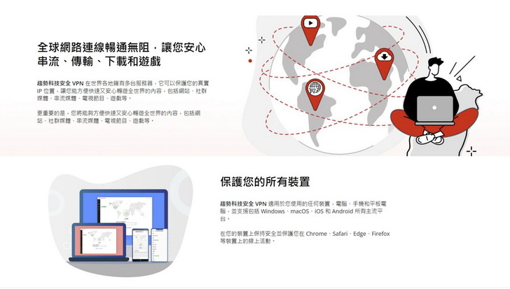 ★ 更安全的 Web 瀏覽方式 - 世界領先加密技術、全球多台伺服器、無頻寬流量限制、操作簡單,一鍵連線